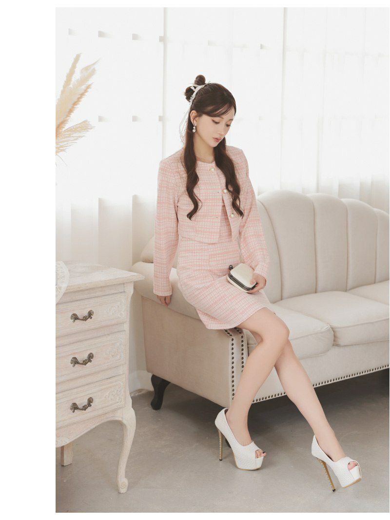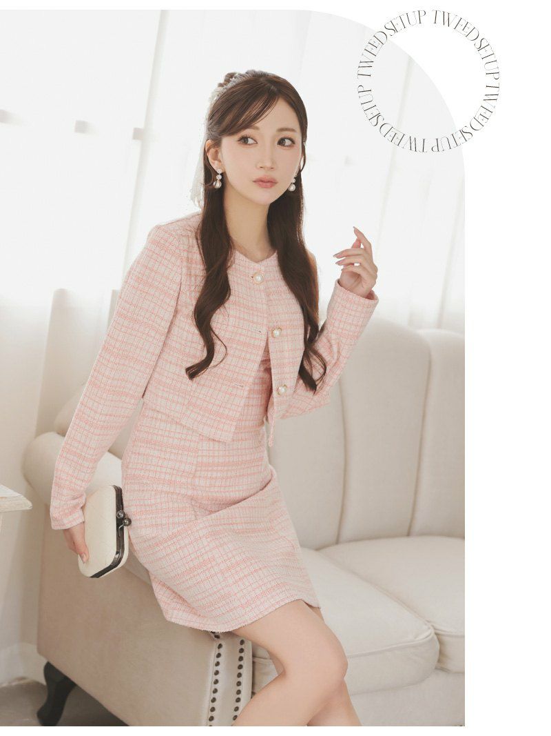 パールボタンとラメツイードで品格を纏う、清楚系チェック柄ワンピーススーツ。 パールボタンが上品に輝くノーカラーのニットツイードチェック柄ワンピーススーツ 【Ryuyu】(XS/S/M/L)(ピンク/ブルー/ホワイト)