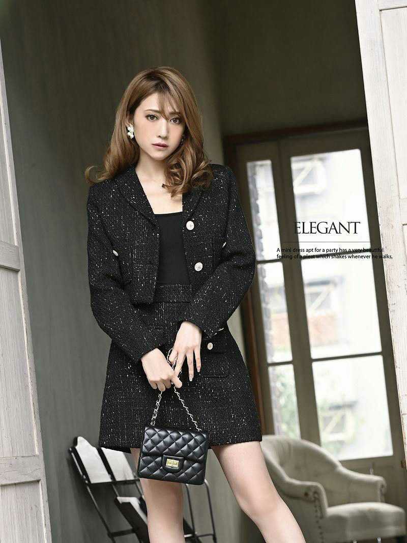 卒業式・入園式・入学式にも! MIXツイードショート丈ジャケットキャバスーツ 加賀美早紀 着用レディーススーツ【Belsia】(S/M/L)(ブラック/アイボリー)