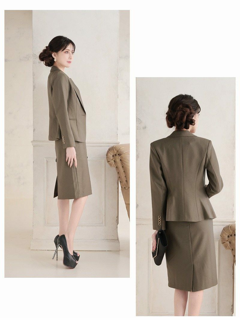 洗練された印象を与えるモスグリーンのワンピーススーツです。