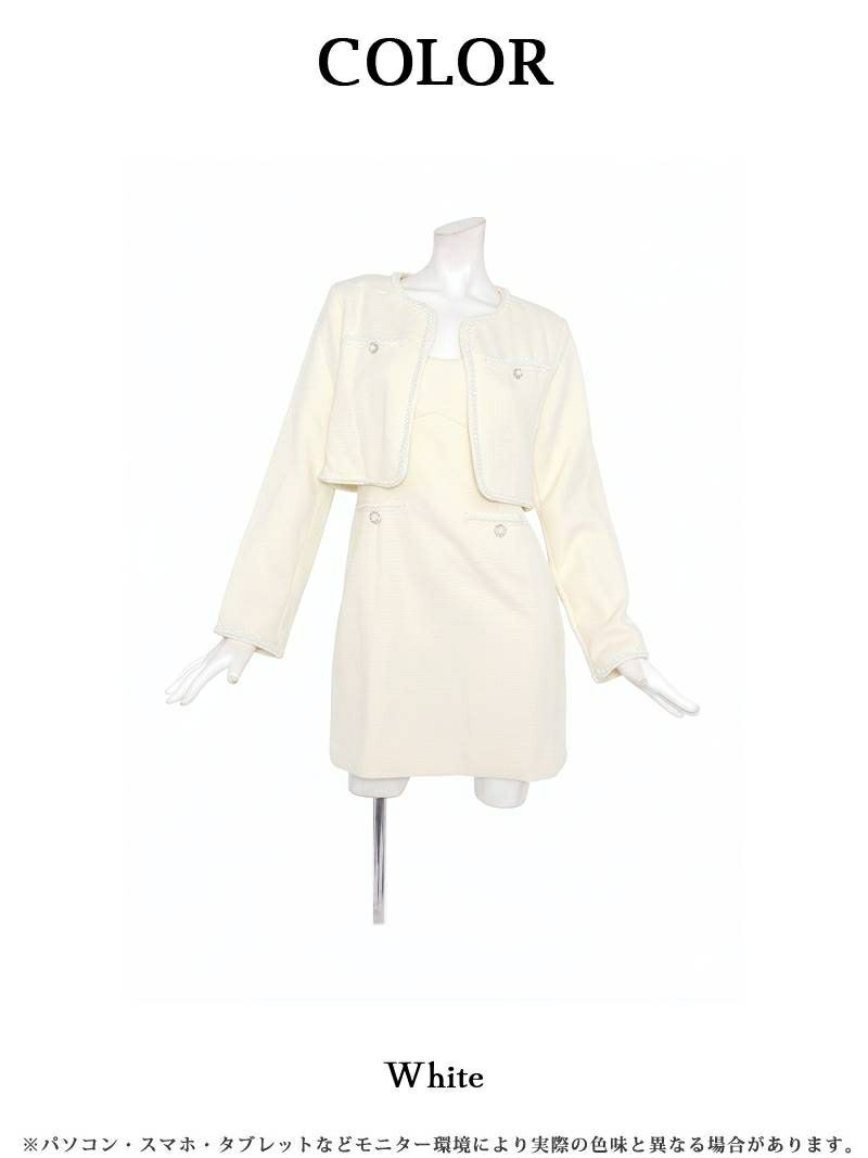 パールの煌めきと白ツイードの気品が織りなす、大人可愛い最上級のセットアップ。 ボレロ風ノーカラージャケット付き白ツイード上品ワンピーススーツ 加賀美早紀 着用キャバスーツ【Belsia】(S/M/L/XL(2L))(ホワイト)