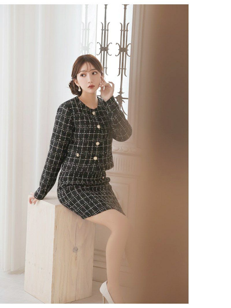 クラシカルなチェック柄のツイード素材が知的な色っぽさを演出するセットアップドレスです。