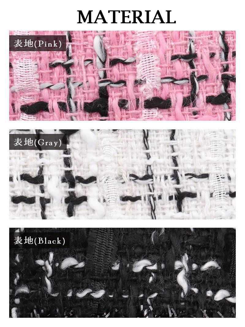 気品溢れるツイードとゴールドボタンでクラスアップを叶える大人のセットアップスーツ ゴールドボタンが華やかなノーカラーチェック柄ツイード長袖セットアップキャバスーツ【Ryuyu】(S/M/L/XL(2L))(ブラック/ピンク/グレー)
