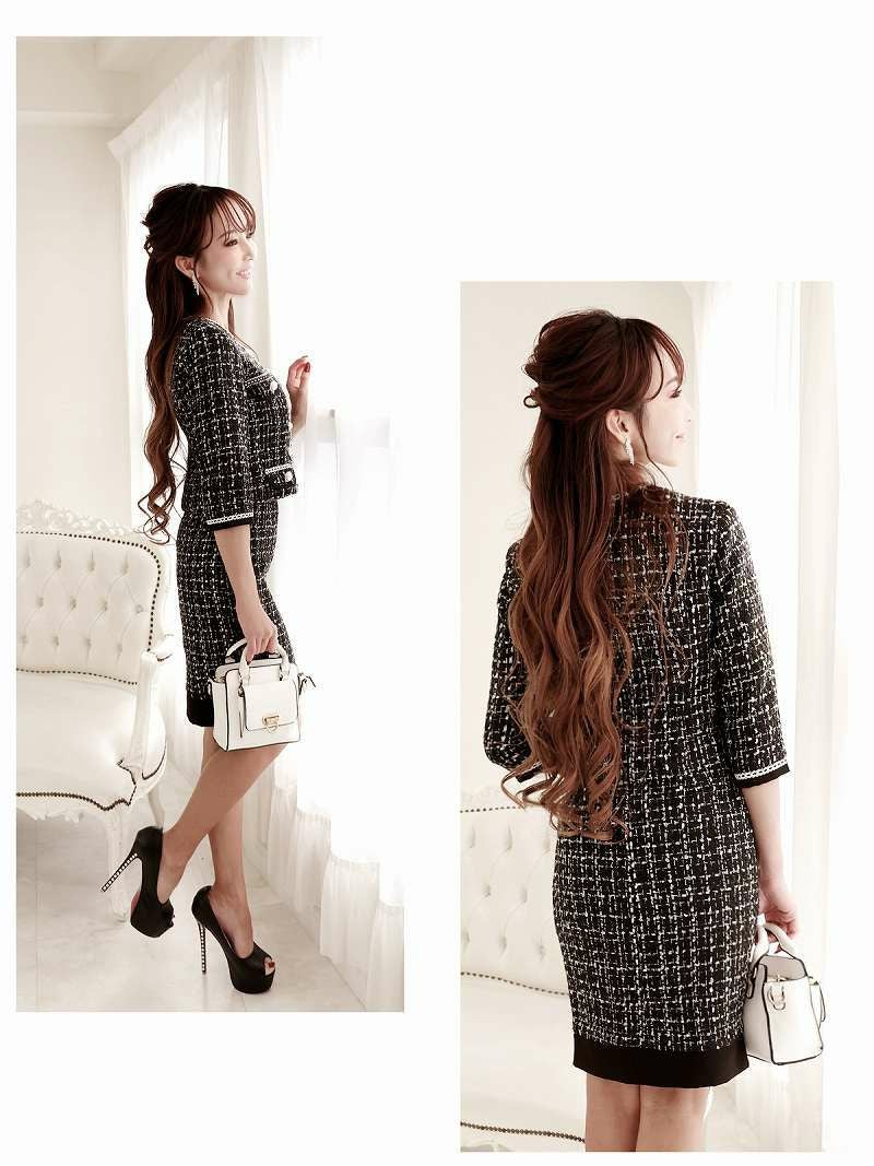 6. フォーマルスーツSALE¥14800→¥11840! ミックスツイードパールボタン膝丈レディーススーツ 武田静加 着用 キャバスーツ【Belsia】(S/M/L)(ブラック/ホワイト)