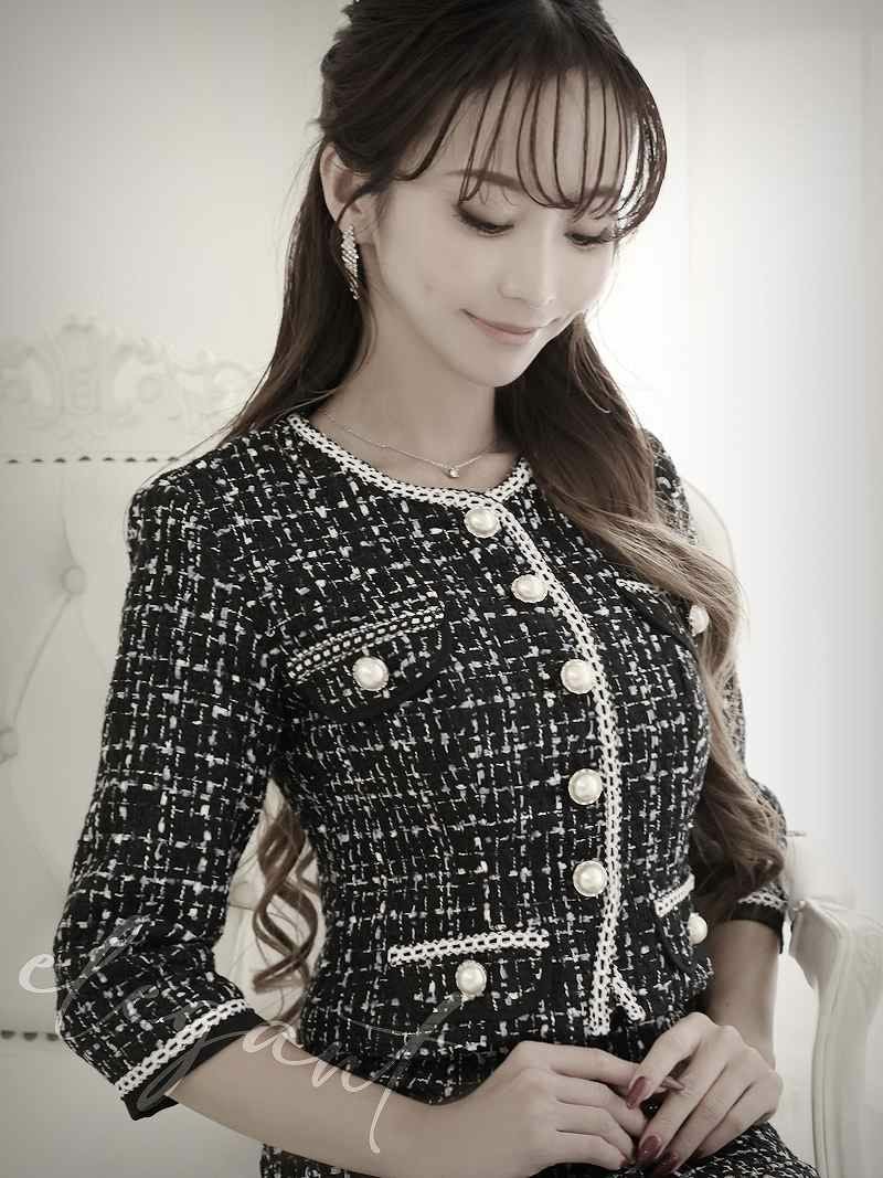 ミックスツイードパールボタン膝丈レディーススーツ 武田静加 着用 キャバスーツ【Belsia】