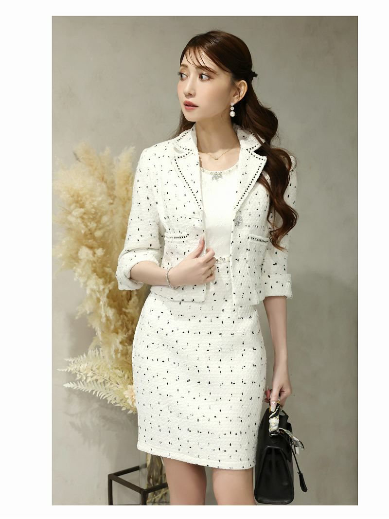 式スーツにもおすすめ 3点セット!!上品パイピングノーカラーツイード膝丈キャバクラスーツ 【BelsiaLUX】(S/M/L/XL)(ホワイト)