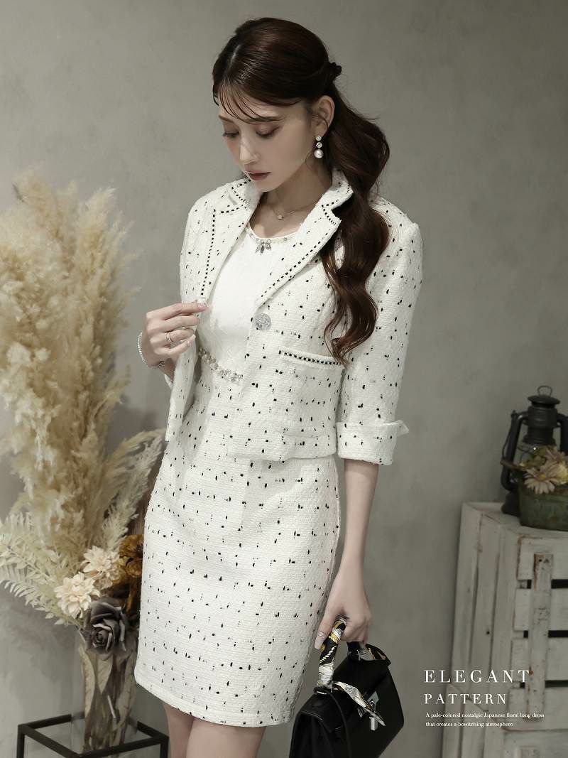 ツイード調で上品で洗練された印象に ジャガードノーカラーフォーマルスーツ 加賀美早紀 着用キャバスーツ【Belsia】(S-M/M-L)(ブラック/ホワイト)