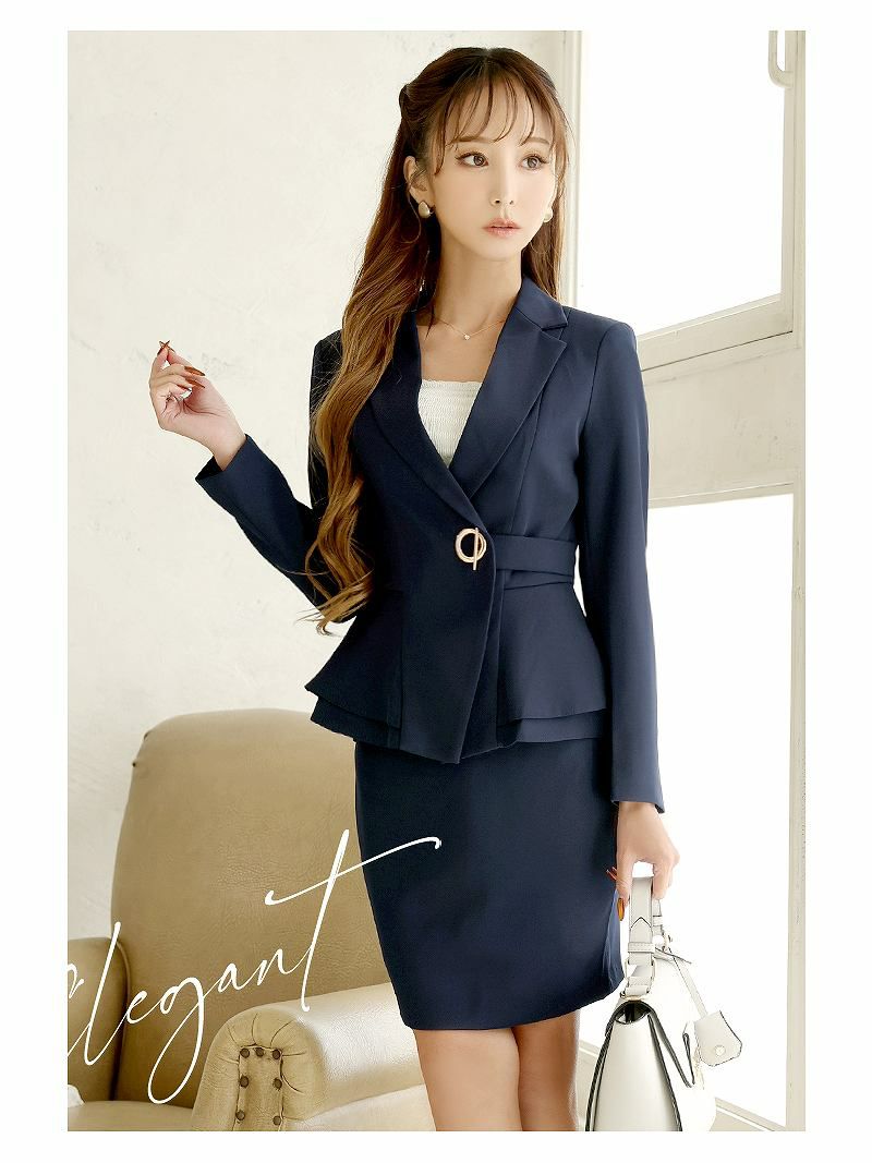 リングベルトがアクセントになったレディーススーツはウエスト部分がペプラムデザインになってるので、