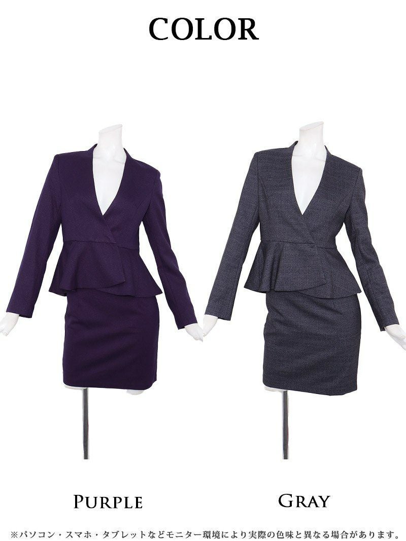 高級感漂うノーカラーとペプラムの魔法で、凛とした美しさを纏う。 先行予約割¥13800→¥13109!※一部予約販売※上質ノーカラージャケット&タイトミニスカートセットアップフォーマルスーツ 加賀美早紀 着用 キャバドレス【BelsiaLUX】(S/M/L/XL(2L))(パープル/グレー)