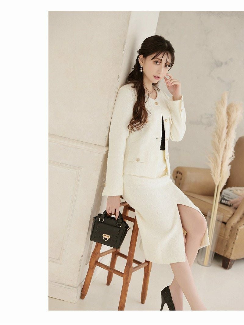 上品なツイード素材を使用した、大人な雰囲気漂うセットアップです。
