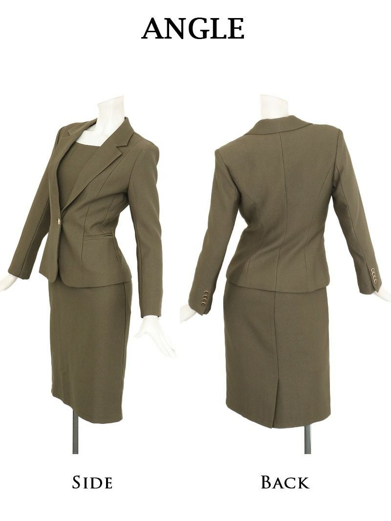 洗練された印象を与えるモスグリーンのワンピーススーツです。