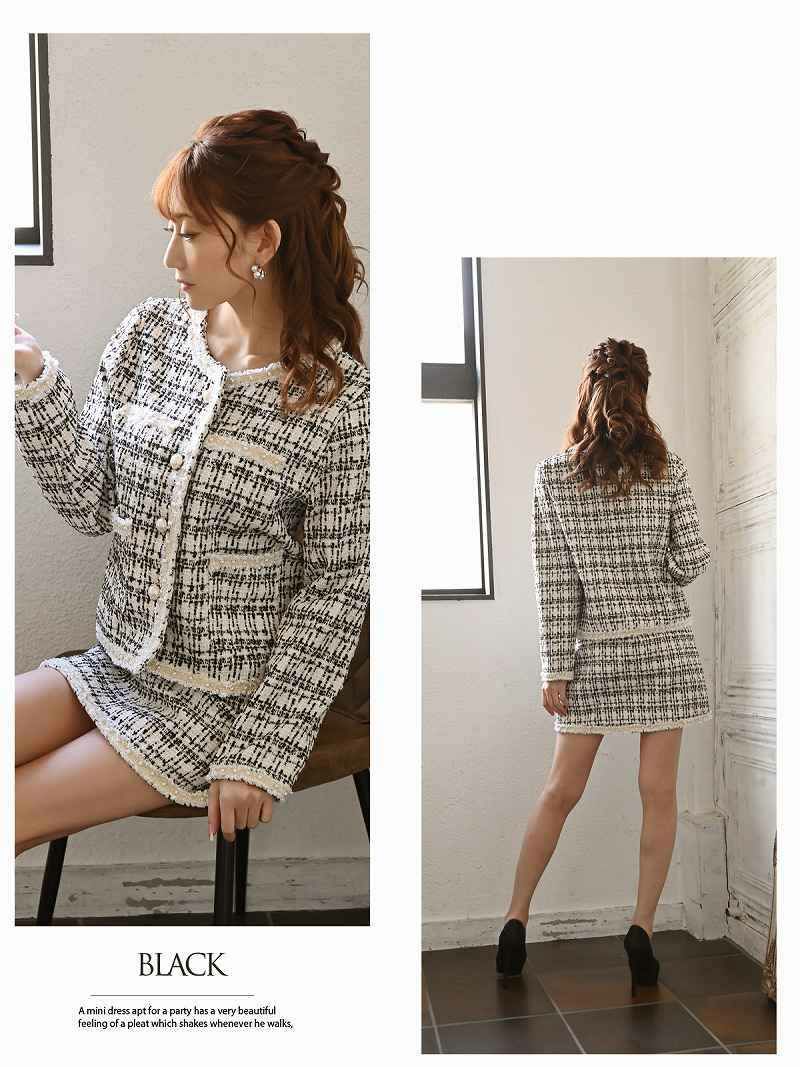 おしゃれな韓国っぽツイードスーツ♪ フォーマルスーツSALE¥12800→¥8960! ツイードビジューデザインミニ丈キャバスーツ 武田静加 着用 プリーツスカートスーツ【Belsia】(M/L)(ブラック/ホワイト)