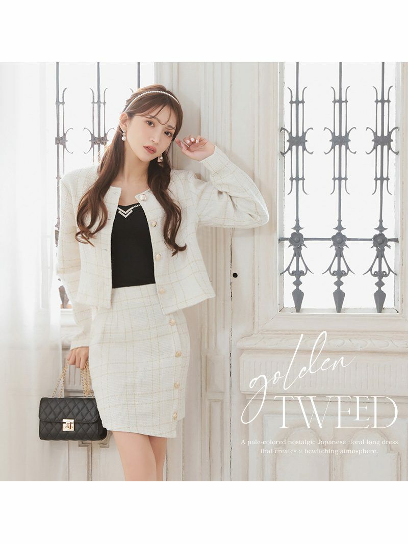 先行予約割¥13800→¥13109!※一部予約販売※ゴールドボタンノーカラーツイードセットアップスーツ 加賀美早紀 着用 キャバスーツ【Belsia】(S/M/L/XL(2L))(ブラック(S/M/XL/3月下旬)/オフホワイト(S/M/3月下旬))