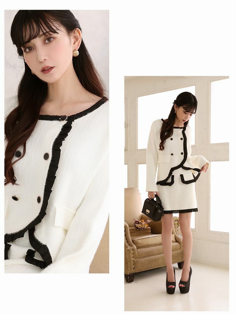 大人ガーリーな雰囲気が男ウケ抜群! フォーマルスーツSALE¥10980→¥8784! フリンジデザインモヘア調長袖ニットレディーススーツ【Belsia】(M)(ブラック/ホワイト)