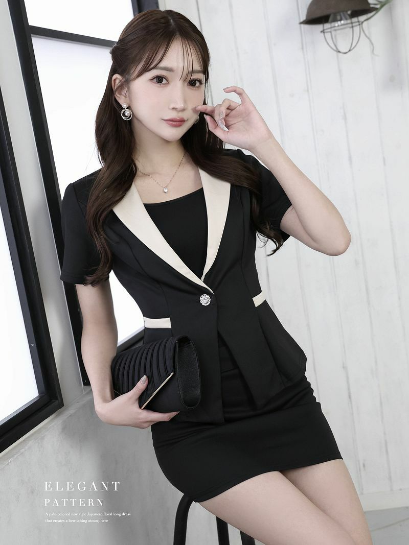配色ワンピが高級感ありセットアップ ジャケット付き派手柄タイトワンピースキャバスーツ【Ryuyu】(S/M/L/XL)(ホワイト/ブラック)