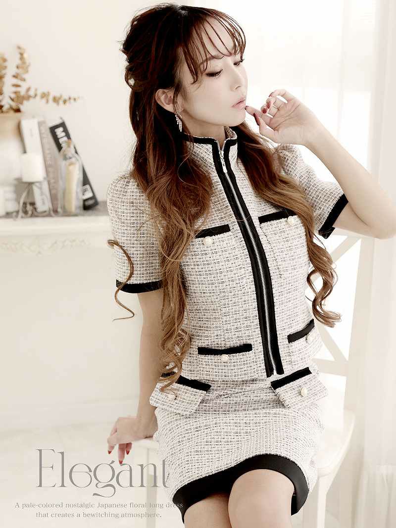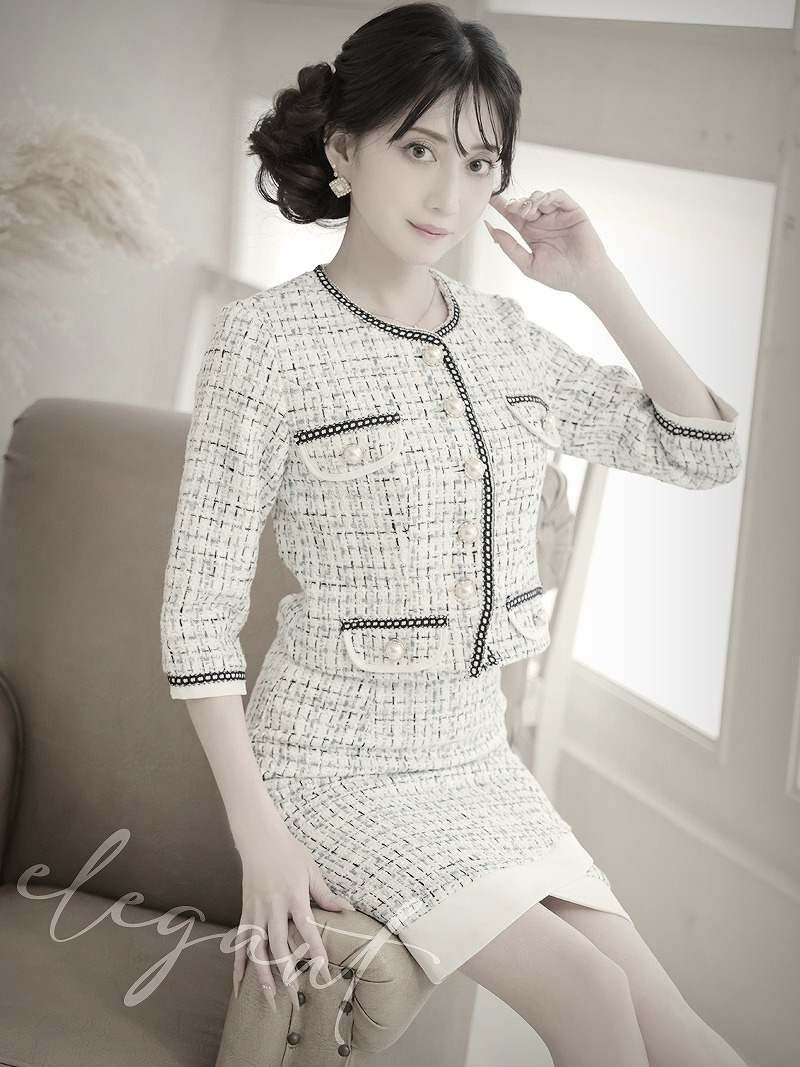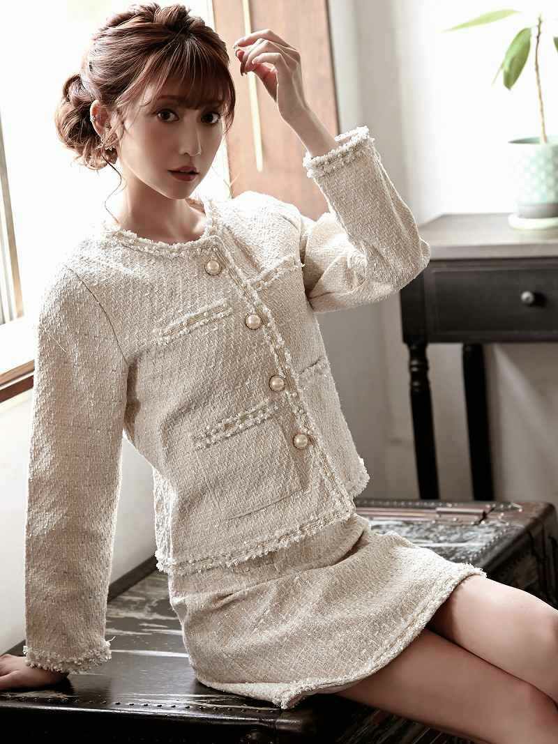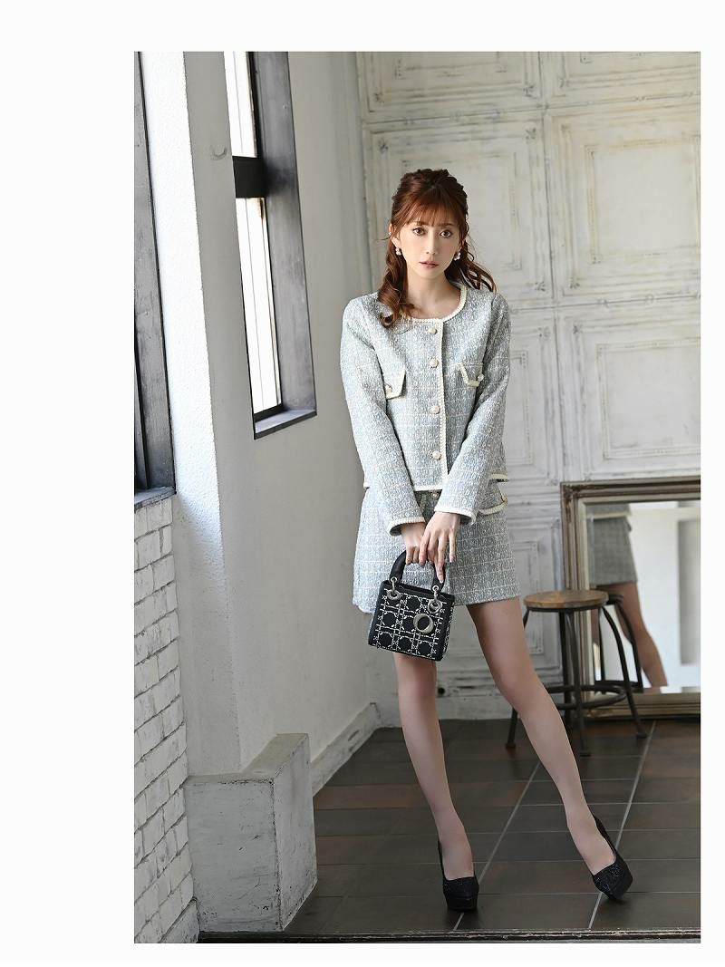 カラーツイードがかわいい!! スーパーSALE¥9480→¥7584! 上品MIXツイード襟付きキャバクラスーツ 加賀美早紀 着用キャバスーツ 【Belsia】(S/M/L)(ホワイト/グレー)