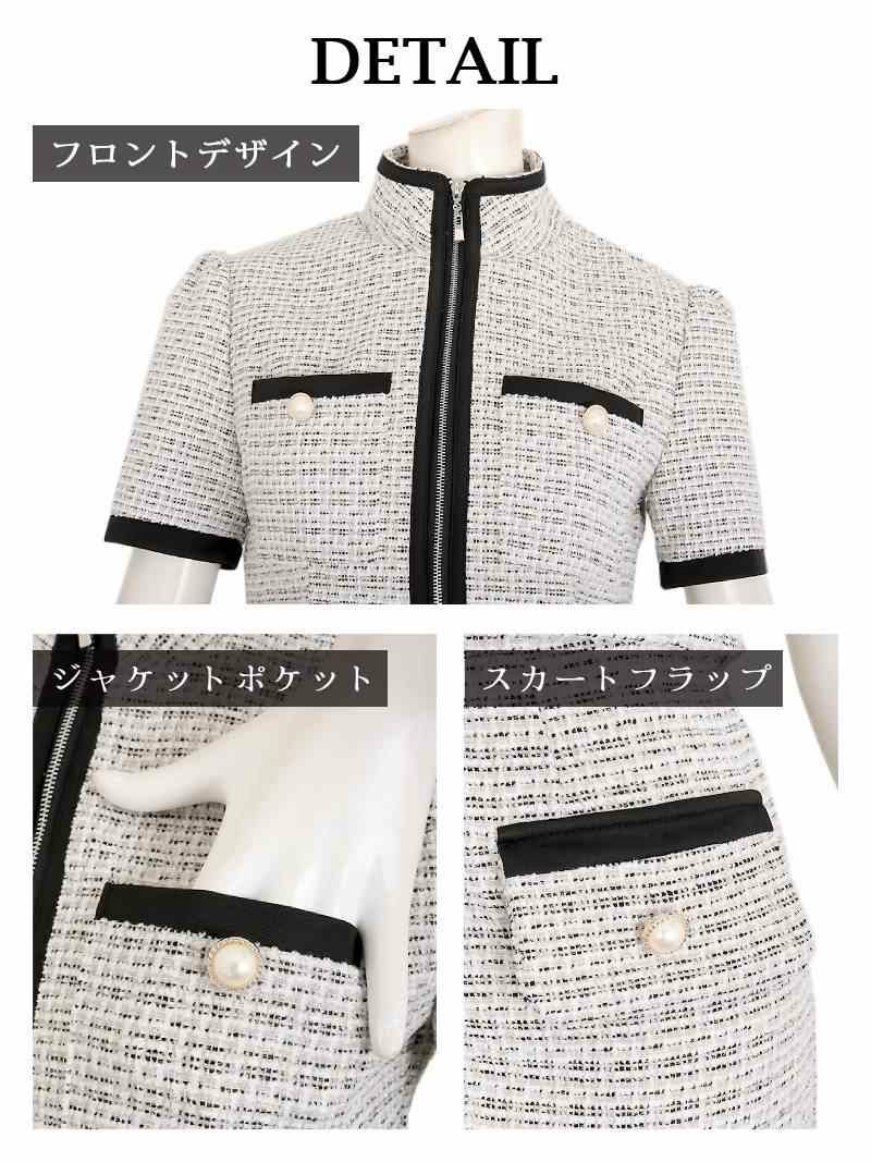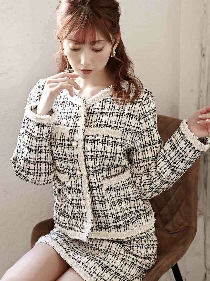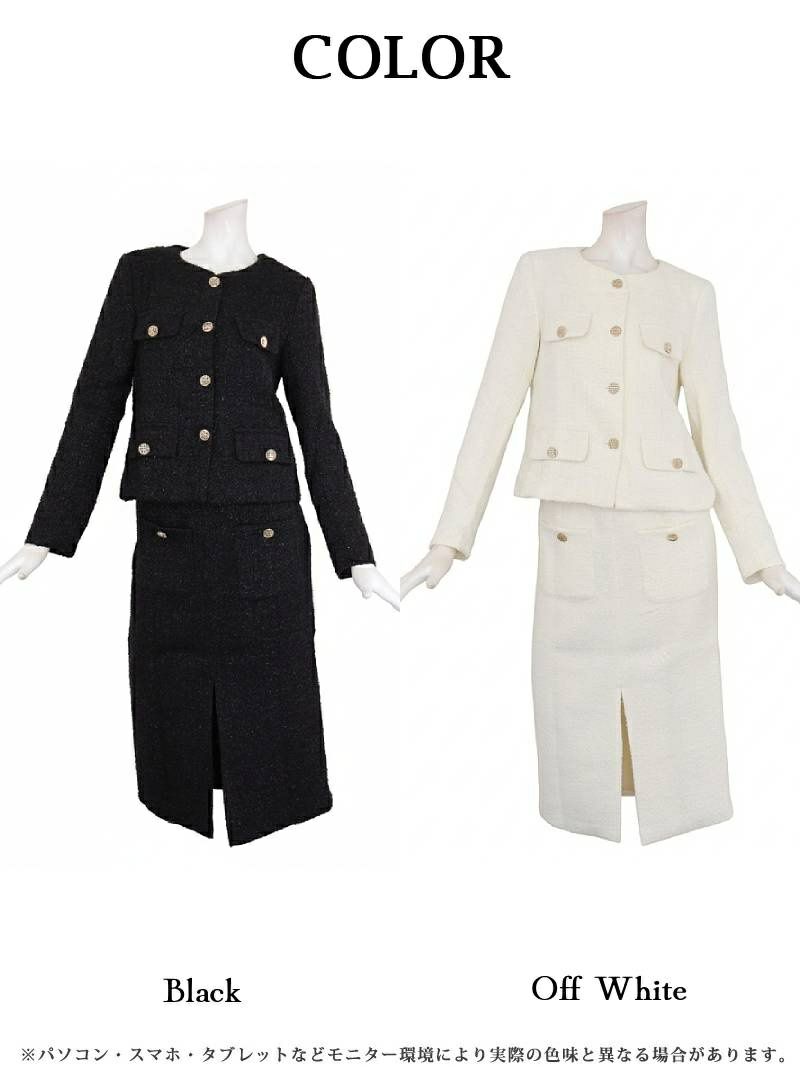 入学式や卒業式でも映える一着♪ スーパーSALE¥14800→¥11840! ノーカラージャケットミックスツイード膝丈スーツ 加賀美早紀 着用 キャバスーツ【Belsia】(S/M/L)(ブラック/ホワイト)