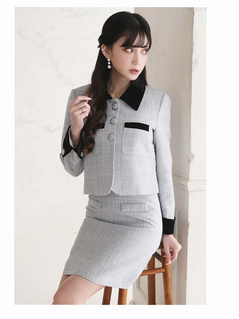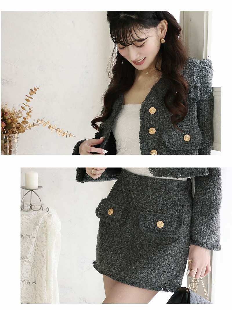 クラシカルな大人可愛いモテスーツ スーパーSALE¥9790→¥7832! グレーツイードシャギー韓国風キャバスーツ 加賀美早紀 着用セットアップスーツ【Belsia】(S/M/L)(グレー)