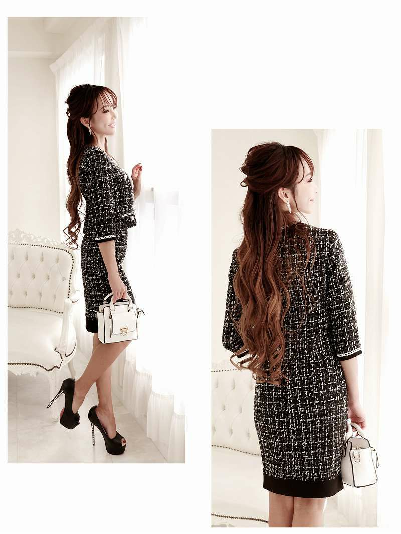 カラーツイードでおしゃれ上級者! スーパーSALE¥9480→¥7584! カラーツイード膝丈タイトキャバスーツ 加賀美早紀 着用レディーススーツ【Belsia】(S/M/L)(ブラック/ピンク)