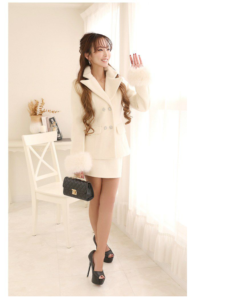 袖にふわふわ可愛いフォーマルスーツ スーパーSALE¥14800→¥11840! 袖ファー付きフォーマルミニ丈レディーススーツ 武田静加 キャバスーツ【Belsia】(S/M/L)(アイボリー/ブラック)