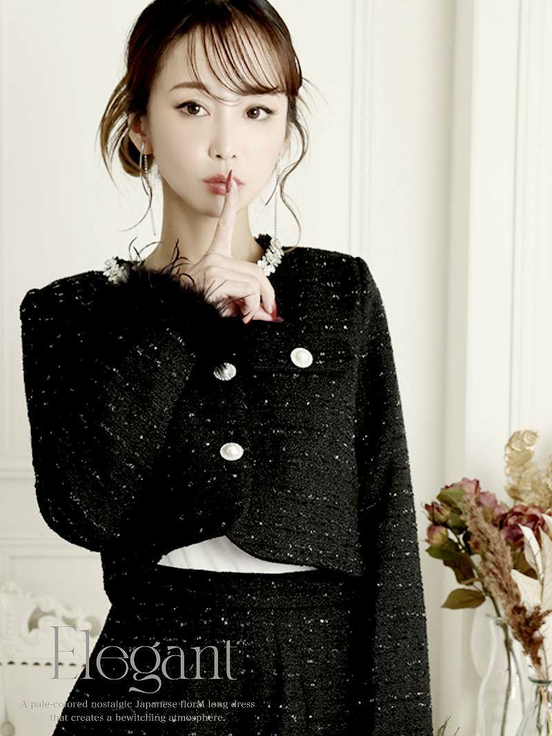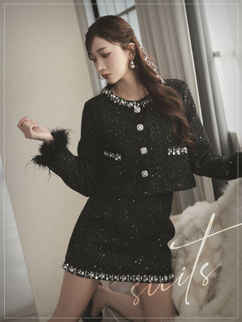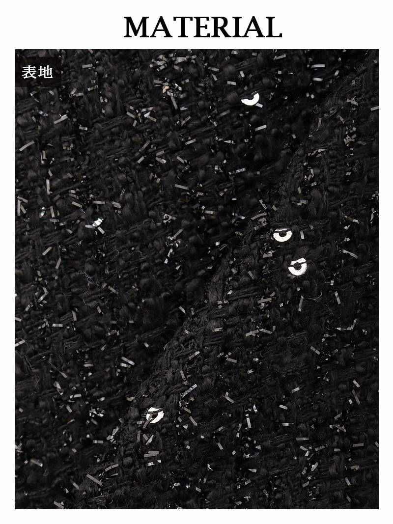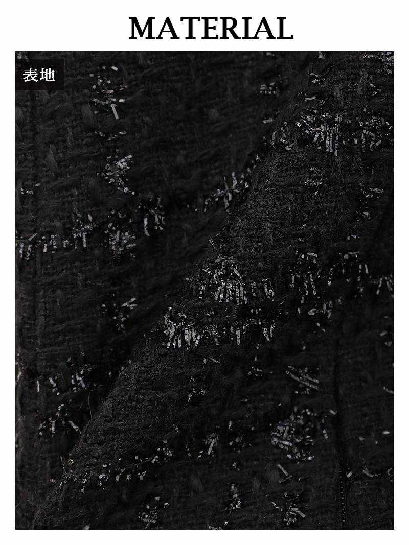 華やかなラメツイードとフリンジ使いで気品溢れる大人のキャバスーツ。 ラメ入りツイードフリンジノーカラージャケットセットアップキャバスーツ 【Ryuyu】(S/M/L/XL(2L))(ブラック)