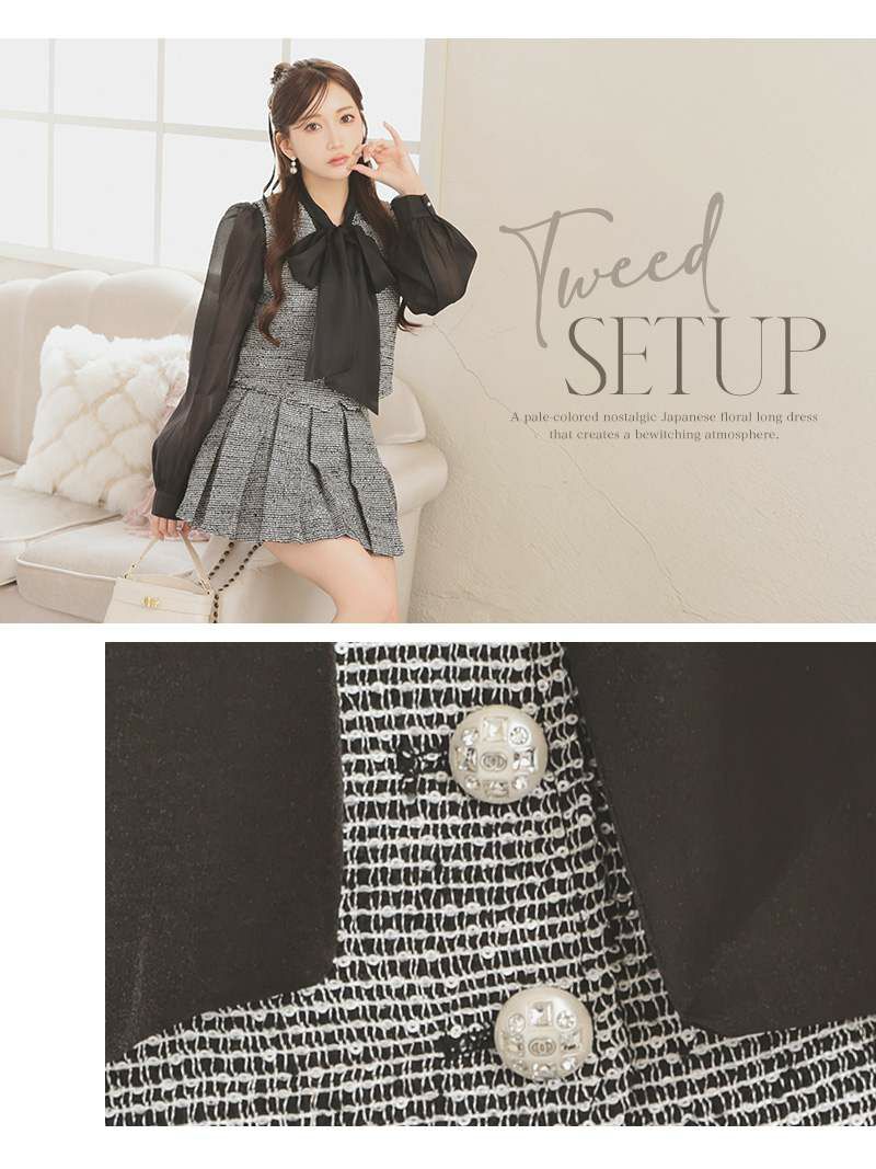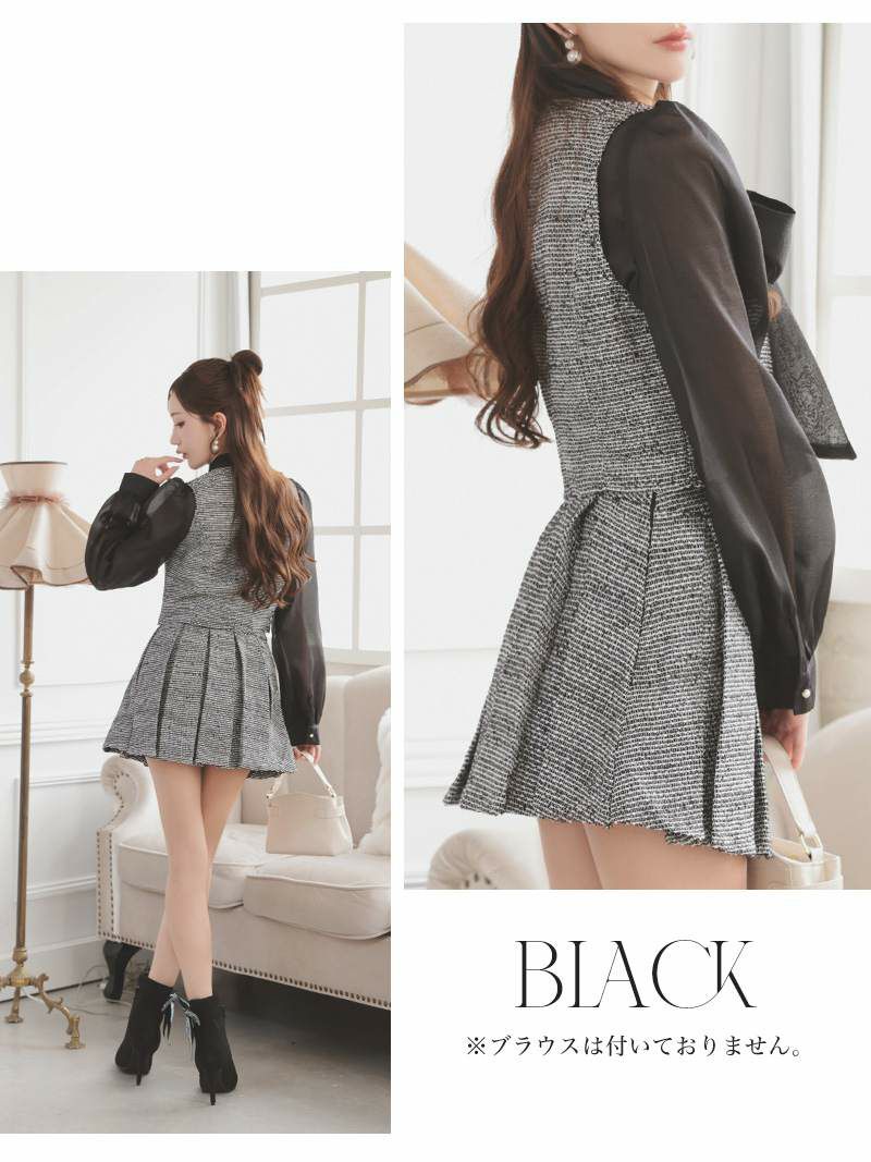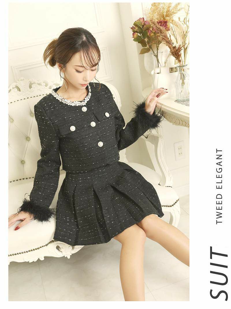 おしゃれな韓国っぽツイードスーツ♪ スーパーSALE¥12800→¥10239! ツイードビジューデザインミニ丈キャバスーツ 武田静加 着用 プリーツスカートスーツ【Belsia】(M/L)(ブラック/ホワイト)