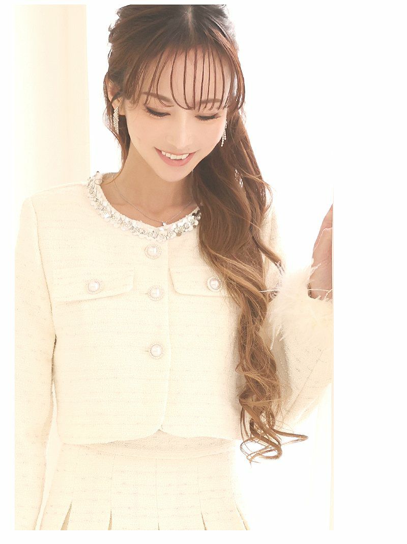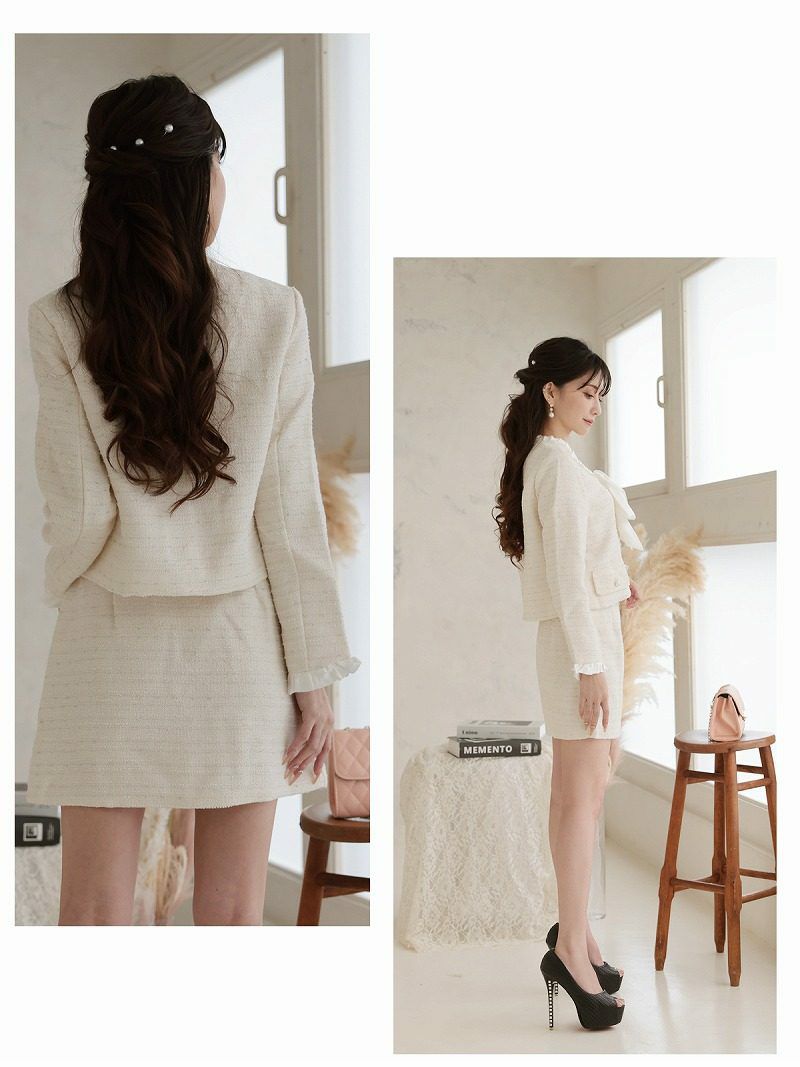 ボレロ風のジャケットでスタイルアップ スーパーSALE¥12800→¥11520! 韓国風ラメツイードキャバスーツ 加賀美早紀 着用セットアップ【BelsiaLUX】(S/M/L)(オフホワイト/ピンク/グレー)
