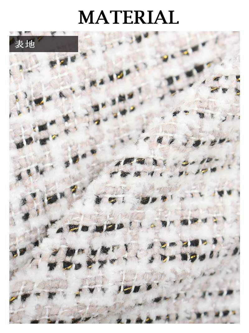 煌めくゴールドラインに視線集中! 高級感あふれるエレガントツイードスーツ。 先行予約割¥7390→¥7021!※一部予約販売※ゴールドラインチェック柄ノーカラーツイードセットアップキャバスーツ【Ryuyu】(S/M/L/XL(2L))(ホワイト/ネイビー)