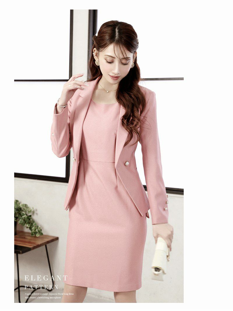 ナチュラル美人になれる大きいサイズスーツ! スーパーSALE¥12800→¥11520! ノーカラージャケットシンプルキャバワンピスーツ 加賀美早紀 着用 レディーススーツ【Belsia】(S/M/L/XL(2L)/XXL(3L))(ピンク/グレー)