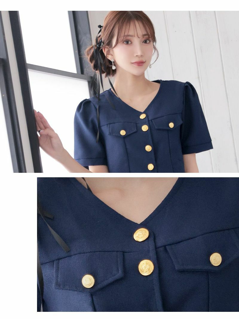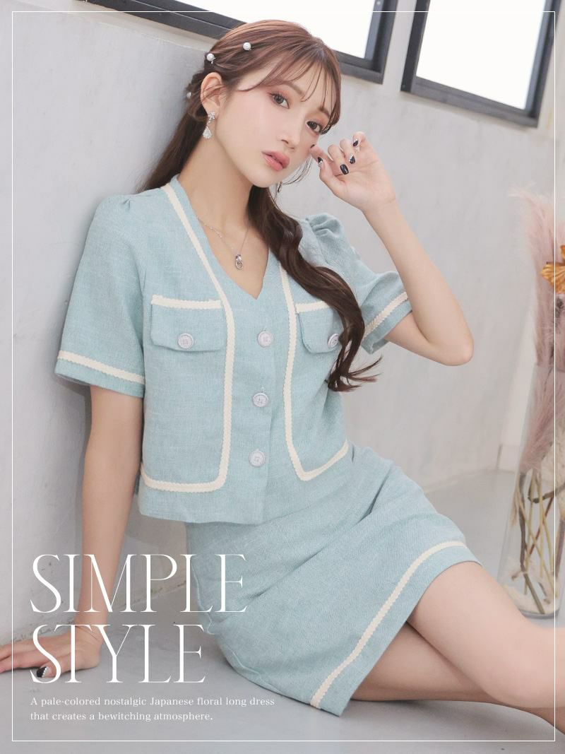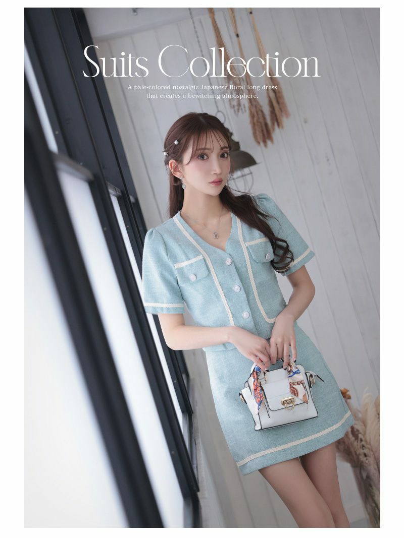 かわいさとクラシカルを叶える韓国風キャバ嬢スーツ スーパーSALE¥7390→¥6651! カラーツイード半袖セットアップキャバスーツ【Ryuyu】(S/M/L/XL(2L))(ネイビー/グリーン)