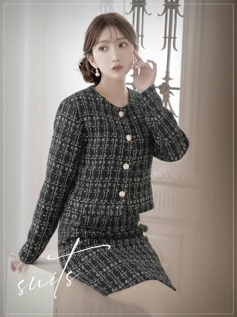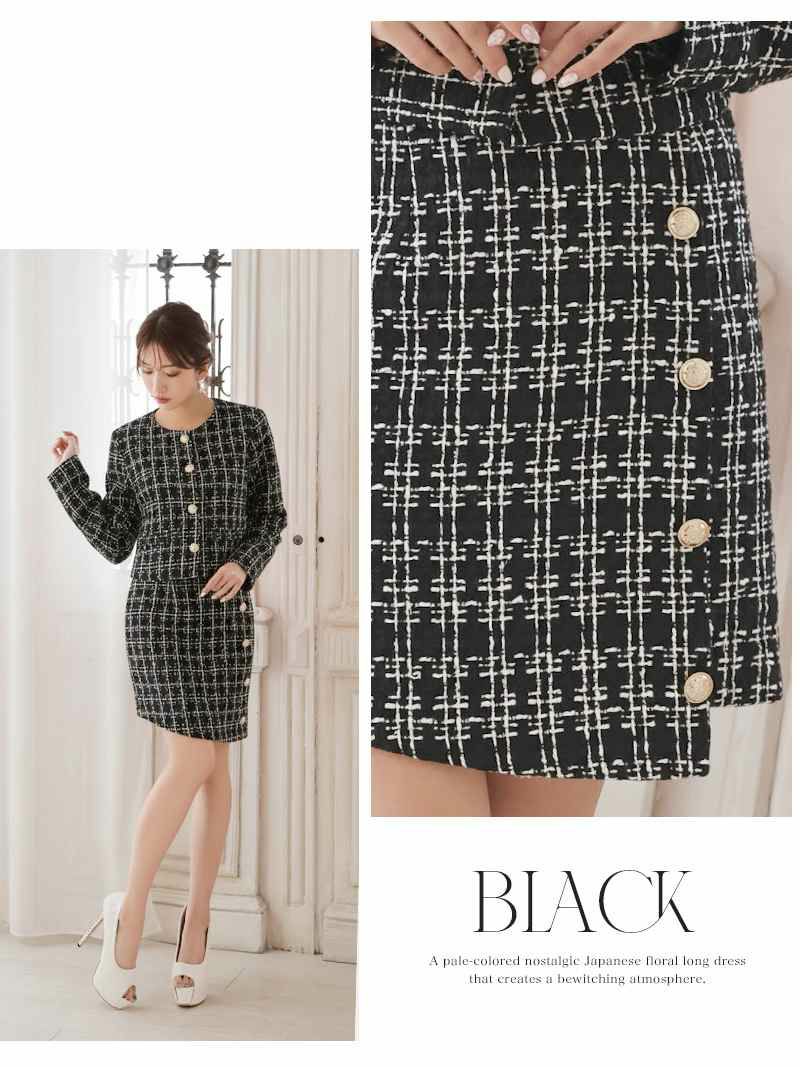 気品溢れるツイードとゴールドボタンでクラスアップを叶える大人のセットアップスーツ ゴールドボタンが華やかなノーカラーチェック柄ツイード長袖セットアップキャバスーツ【Ryuyu】(S/M/L/XL(2L))(ブラック/ピンク/グレー)