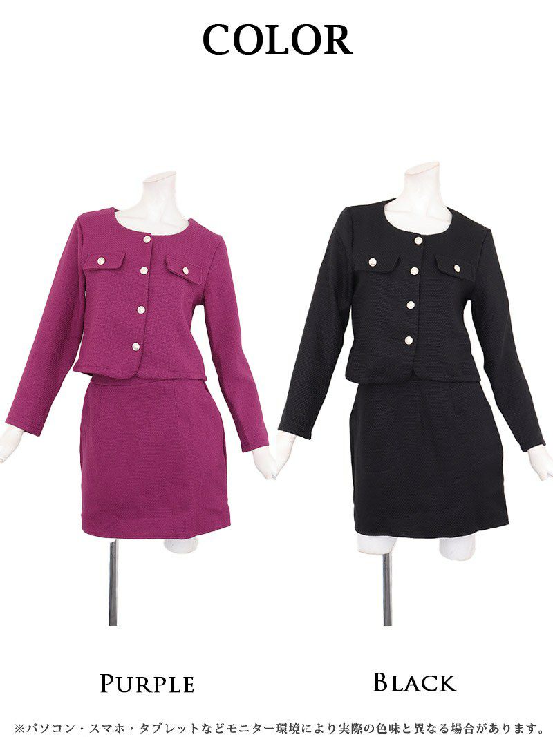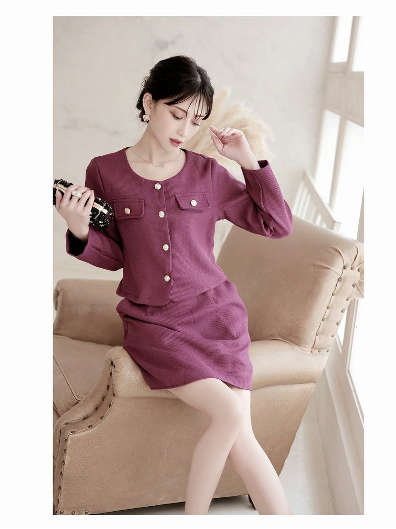 高級感漂うノーカラーとペプラムの魔法で、凛とした美しさを纏う。 先行予約割¥13800→¥13109!※一部予約販売※上質ノーカラージャケット&タイトミニスカートセットアップフォーマルスーツ 加賀美早紀 着用 キャバドレス【BelsiaLUX】(S/M/L/XL(2L))(パープル/グレー)