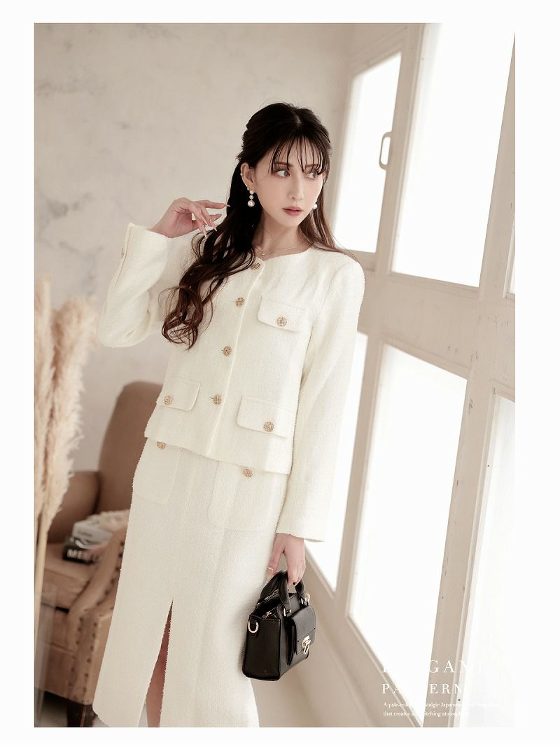 ゴールドボタンが煌めく、ツイード素材の気品あふれるタイトセットアップ。 先行予約割¥13800→¥13109!※一部予約販売※ノーカラーツイードゴールドボタンセットアップスーツ 加賀美早紀 着用 キャバスーツ【Belsia】(S/M/L/XL(2L))(ブラック(S/M/XL/3月下旬)/オフホワイト(S/M/3月下旬))