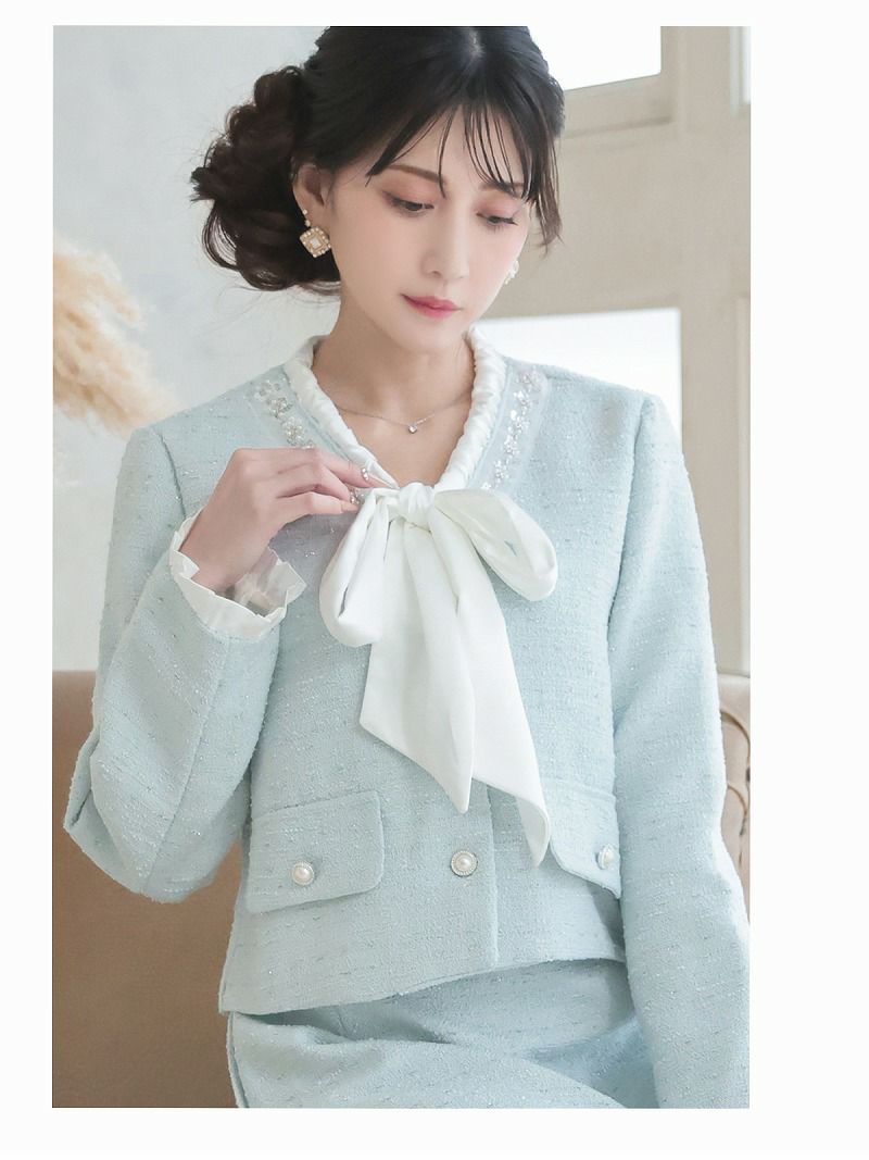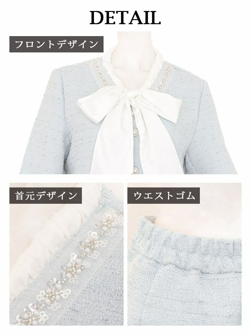 煌めくラメ入りツイードとボウタイリボンで、圧倒的な気品を纏う正統派セットアップスーツ。 先行予約割¥10800→¥10260!※一部予約販売※ボウタイリボンラメ入りツイードセットアップスーツ 加賀美早紀 着用 キャバスーツ【Belsia】(S/M/L/XL(2L))(ホワイト/ブルー)