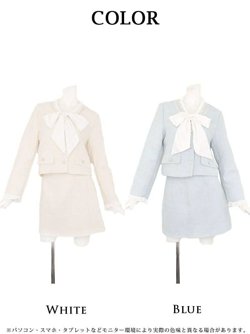 大きなリボンと煌めくビジューに視線が集中する、清楚可愛い最旬ツイードセットアップ。 先行予約割¥10800→¥10260!※一部予約販売※ボウタイリボン付きビジューボタンツイードセットアップミニスーツ 加賀美早紀 着用 キャバスーツ【Belsia】(S/M/L/XL(2L))(ホワイト/ブルー)