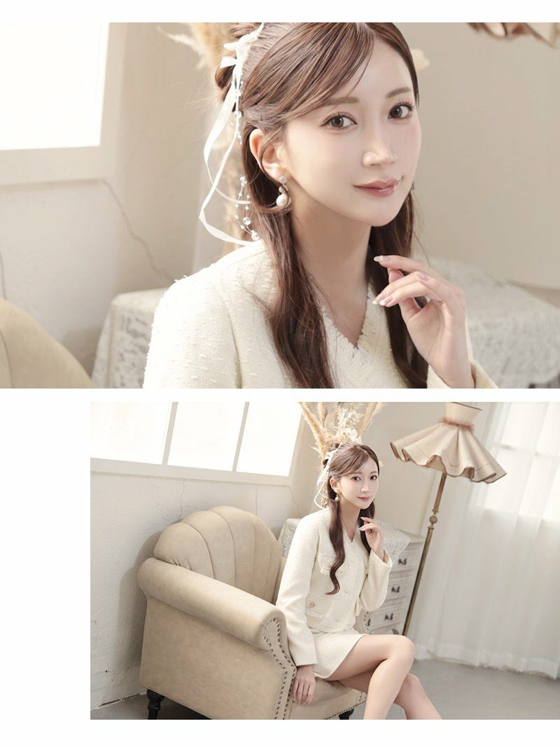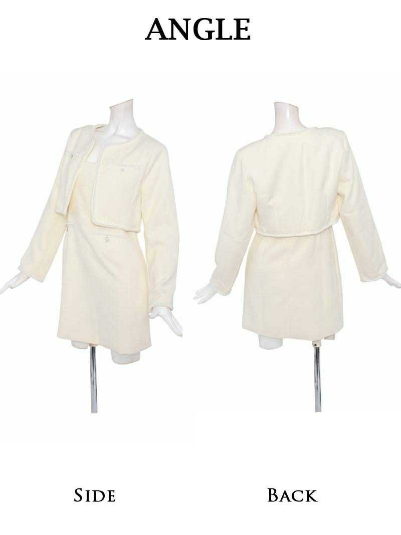 パールの煌めきと白ツイードの気品が織りなす、大人可愛い最上級のセットアップ。 先行予約割¥9900→¥9405!※一部予約販売※ボレロ風ノーカラージャケット付き白ツイード上品ワンピーススーツ 加賀美早紀 着用キャバスーツ【Belsia】(S/M/L/XL(2L))(ホワイト)