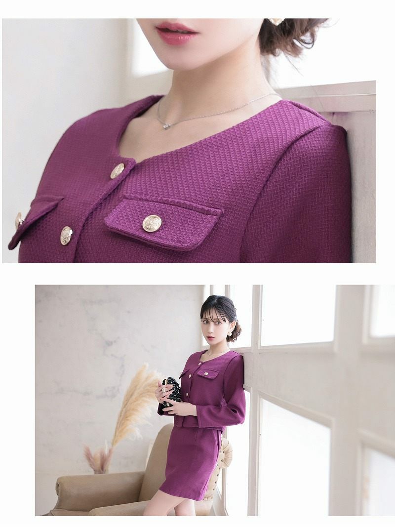 気品溢れるツイード素材でワンランク上の自分を演出するセットアップスーツ。 ノーカラーツイード長袖ミニ丈セットアップキャバスーツ 加賀美早紀 着用キャバスーツ【BelsiaLUX】(M/L/XL(2L)/XXL(3L))(パープル/ブラック)