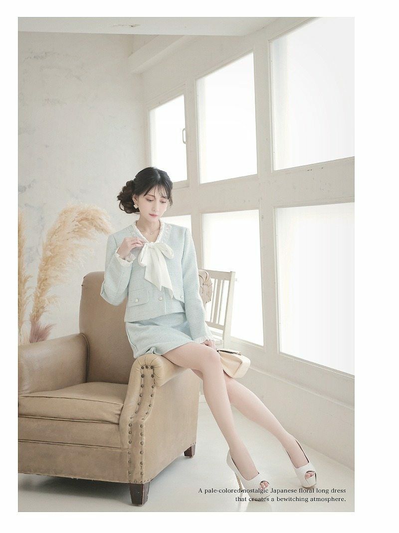 華やか顔周りスッキリカラースーツ♪ スーパーSALE¥9880→¥6915! ノーカラーミックスツイードミニ丈フォーマルスーツ 加賀美早紀 着用 キャバスーツ【BelsiaLUX】(S/M/L)(ブラック/オフホワイト/ミント)