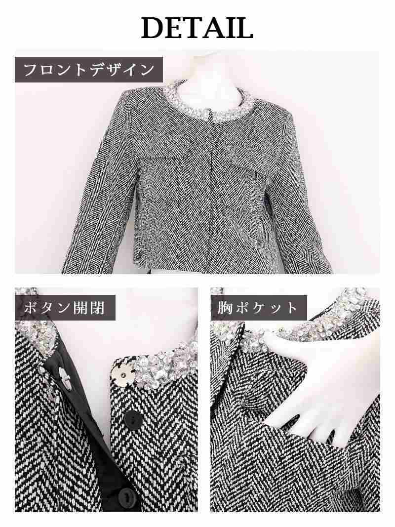 厚手ツイードと煌めくビジューで魅せる、冬の品格セットアップスーツ。 上質厚手ツイード首元ビジューノーカラージャケット&ミニスカートセットアップ冬スーツ 加賀美早紀 着用キャバスーツ【BelsiaLUX】(S/M/L/XL(2L))(ブラック)
