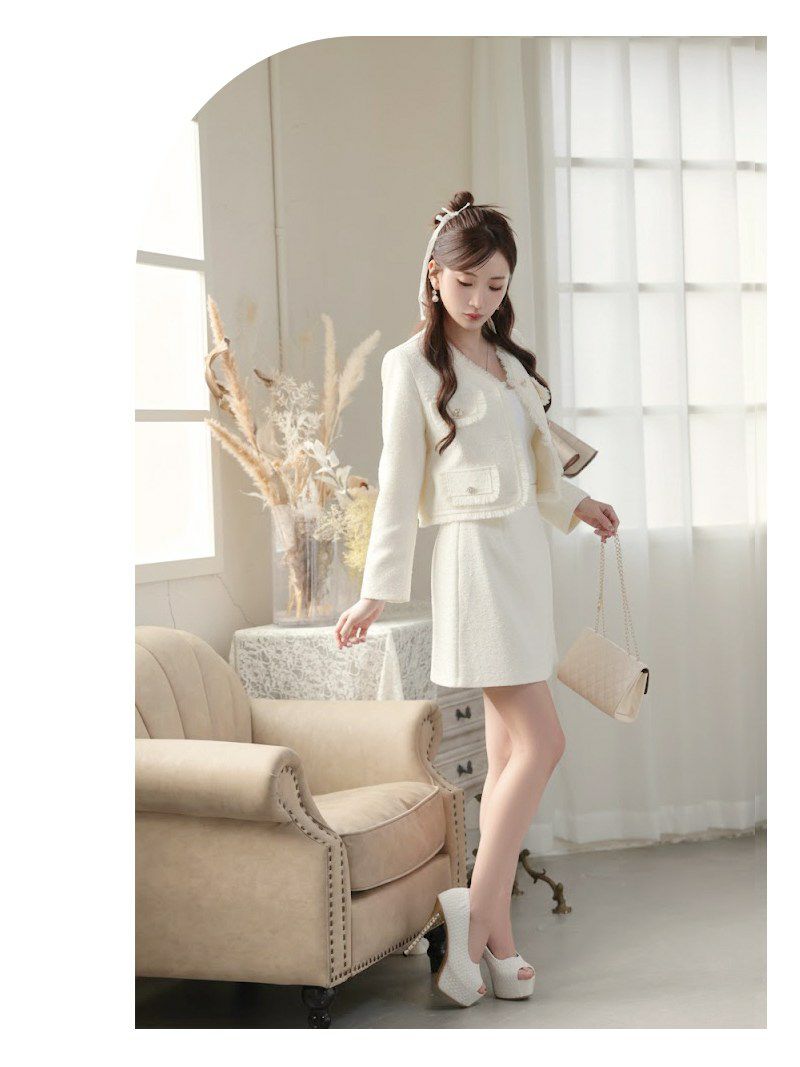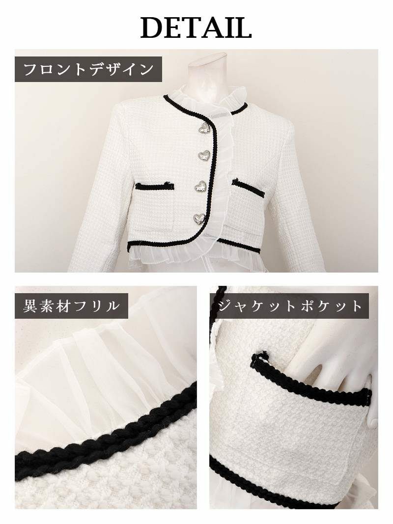 シフォンフリルとパイピングが大人可愛い、愛され確実な厚手ツイードセットアップ! 先行予約割¥7980→¥7581!※一部予約販売※シフォンフリル付き厚手ツイードノーカラーショート丈ジャケット&カシュクールスカートセットアップスーツ【Ryuyu】(S/M/L)(ホワイト)