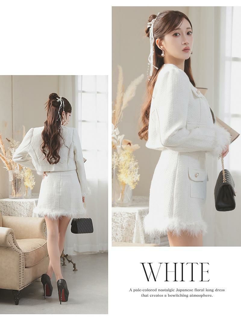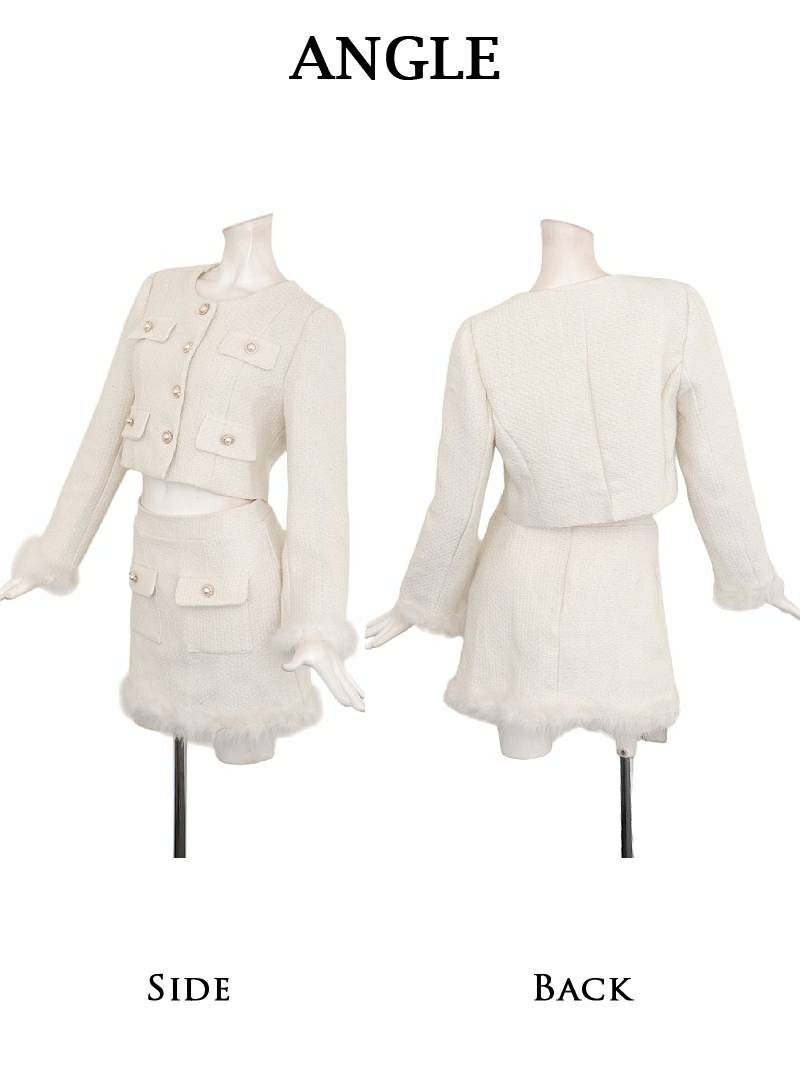 溢れる気品とファーの華やかさで、周りの視線を独占するツイードセットアップ。 高級ツイードファー付きノーカラースーツ パールボタンが上品なインナーパンツ付き白キャバスーツ【Ryuyu】(S/M/L/XL(2L))(ホワイト)