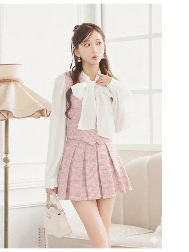 清楚なボウタイと煌めくツイードで、愛され度満点のヒロインスタイルに! スパンコール入りのミックスツイードが上品に輝く、華奢見せも叶うキュートなツイードセットアップ 【Ryuyu】(S/M/L)(ブラック/ピンク)