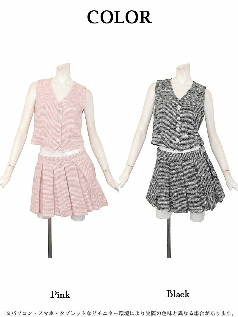 韓国風セットアップスーツ スーパーSALE¥12800→¥10239! キラキラツイードデザインキャバスーツ 武田静加 着用 プリーツスカートスーツ【Belsia】(M/L)(ブラック/ホワイト)