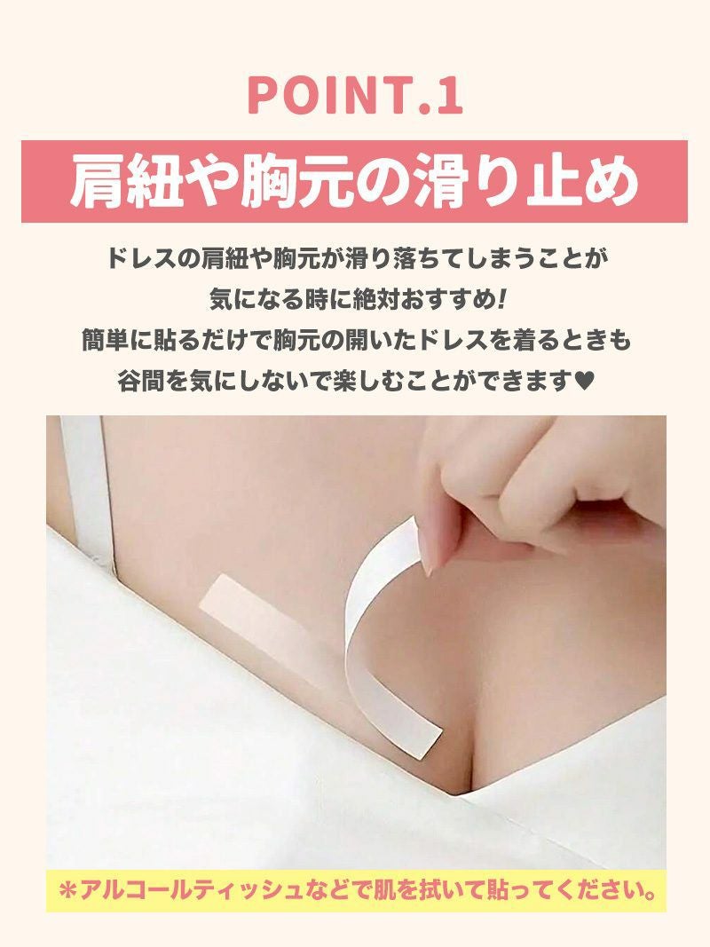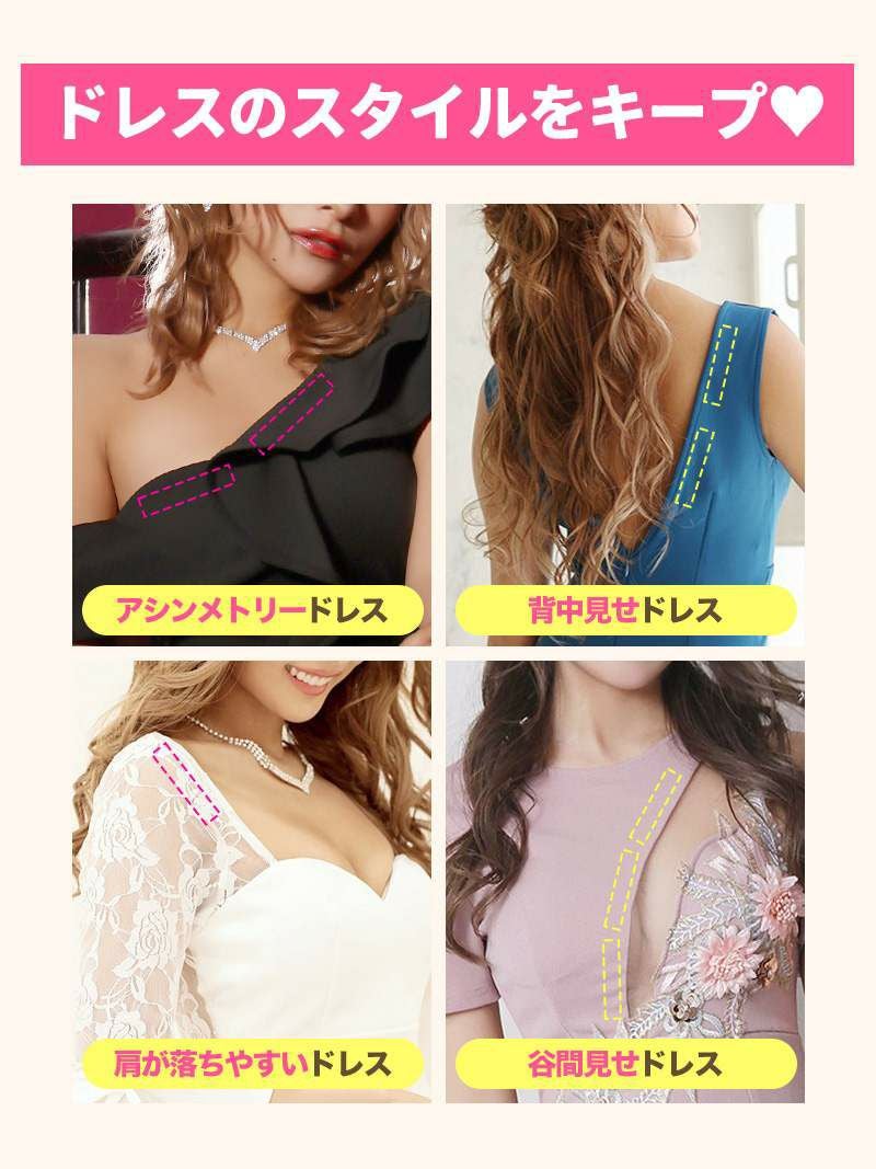 ブラのストラップが見えるときや、ドレスを着たときに胸元の開きがきになる時、オフショルドレスのずれ落ちなどに大活躍!