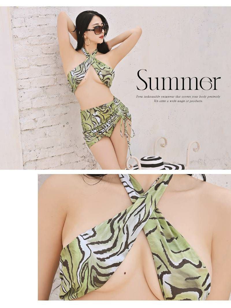 三角ビキニと豹柄トップスの3点水着セットハイレグ仕様セクシータンキニみずぎ【Ryuyu】(フリーサイズ)(ブラック/グリーン/ピンク)