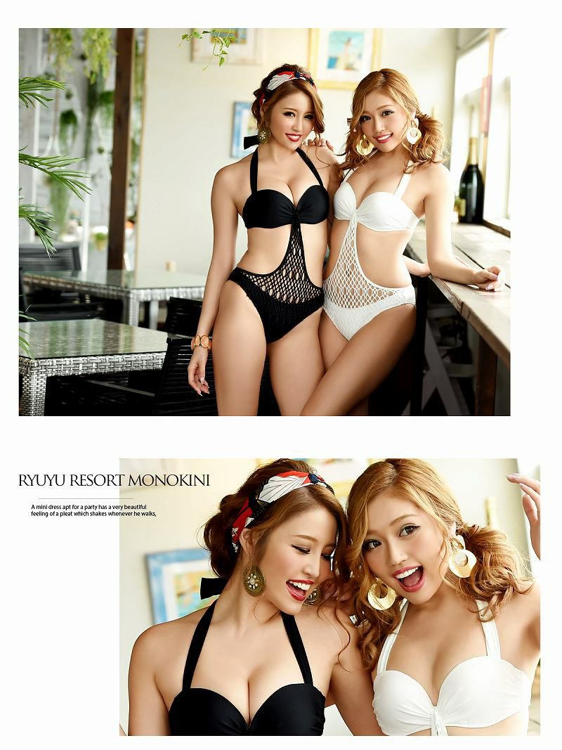 大胆カットデザインがインポート風! スーパーSALE¥4780→¥3823! 水着 ホルターネック谷間盛りクロッシェレースモノキニ かなへぇ かずへー 着用【Ryuyu】レディースみずぎ(S/M)(ブラック/ホワイト)