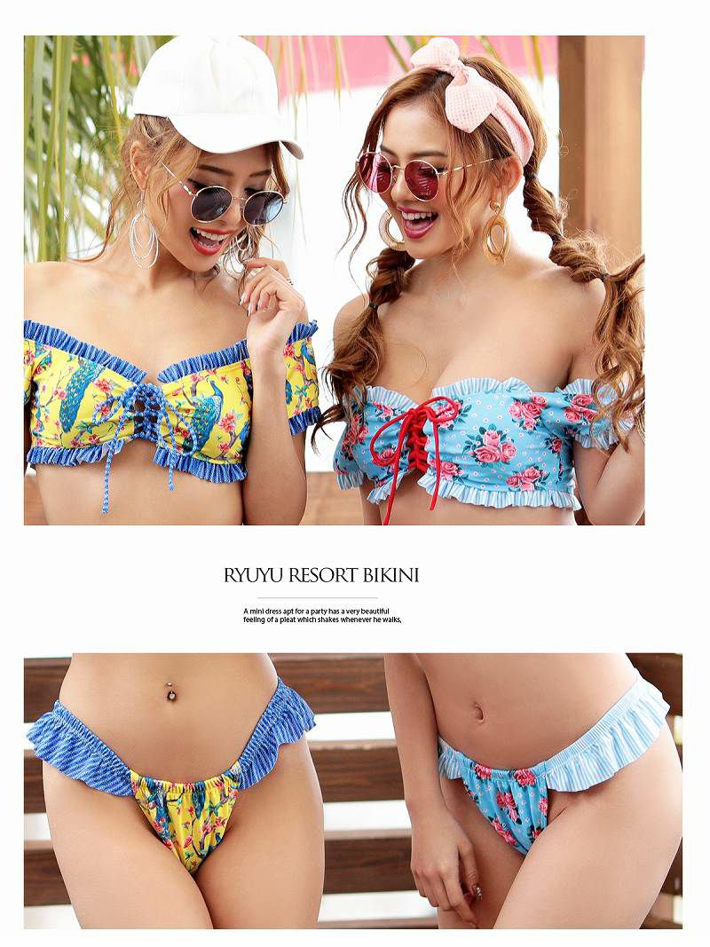 4. 水着 派手柄ドーリー韓国風オフショルビキニ【Ryuyu】レディースみずぎ(M)(イエロー/ブルー)