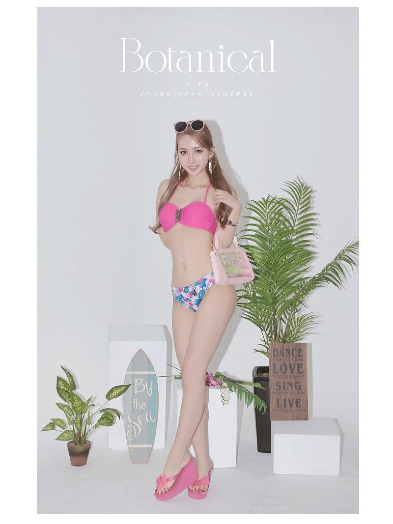 南国気分を盛り上げるカラフルなボタニカル柄のショーツが目を引くビキニです。
