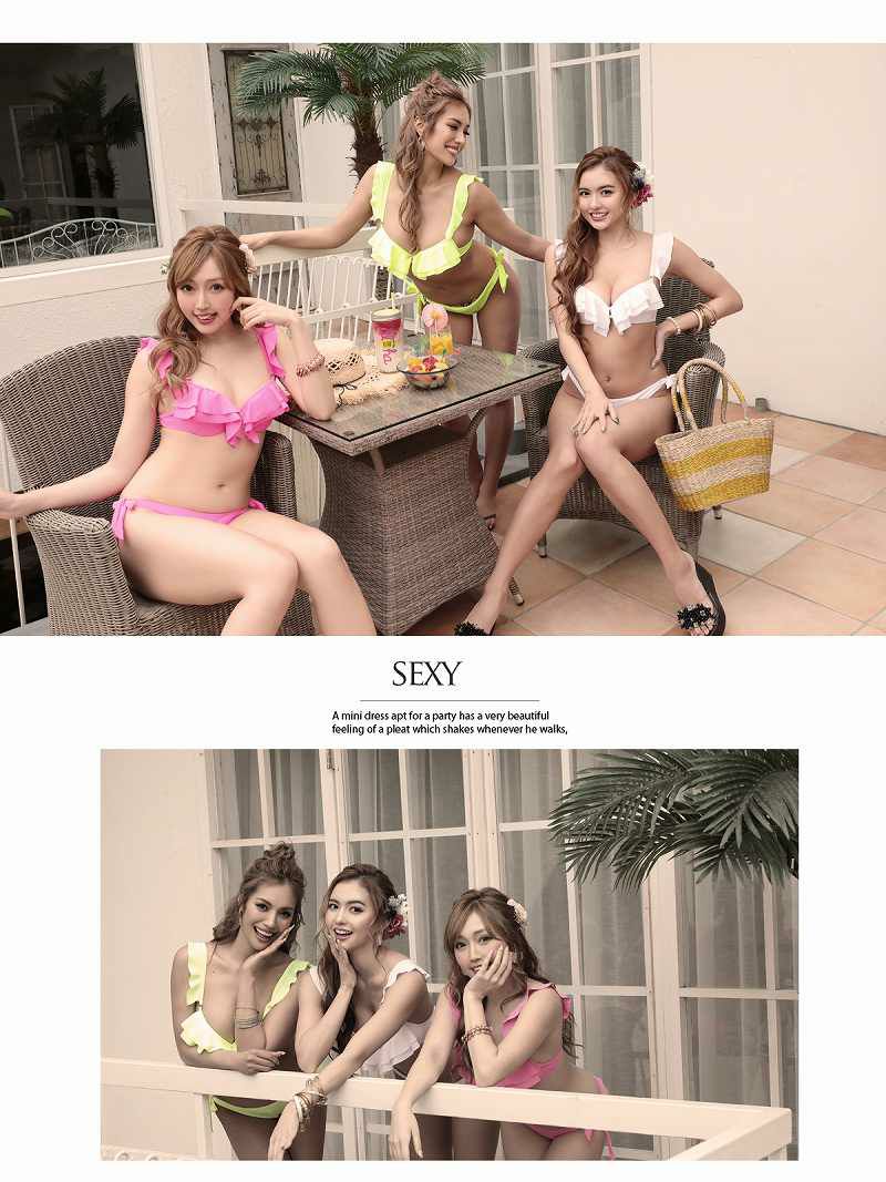 肩から胸元にかけての2段フリルが可愛く揺れるネオンカラーの水着は、インスタ映えもしっかりできちゃうからおそろいで可愛く目立ちたいキャバ嬢さんにおすすめ。