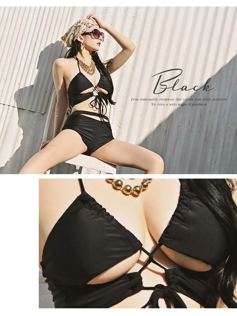 無地ブラックのシンプルさにセクシーさをプラスした、三角ビキニの2点セット。