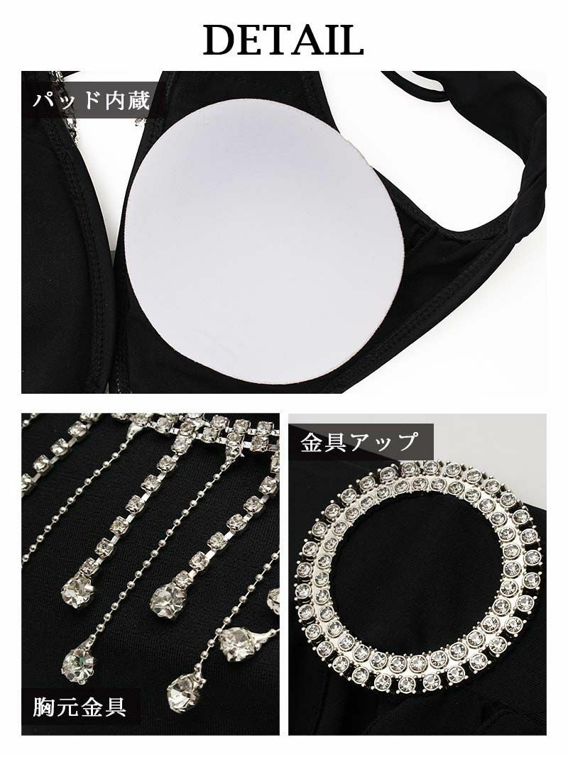胸元のゆらゆら揺れる華やかなビジューフリンジが目を惹くレディース水着は深めのVカットから魅せる谷間がとてもsexyなLA風水着になっています。